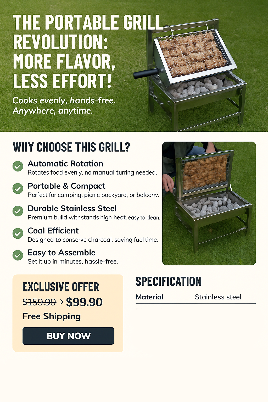 Discover the AutoGrill — the ultimate portable, auto-rotating BBQ. Evenly grills meat hands-free, saving you time and effort. Premium stainless steel, compact design, easy to carry and clean. Perfect for backyard gatherings, camping trips, and outdoor adventures!