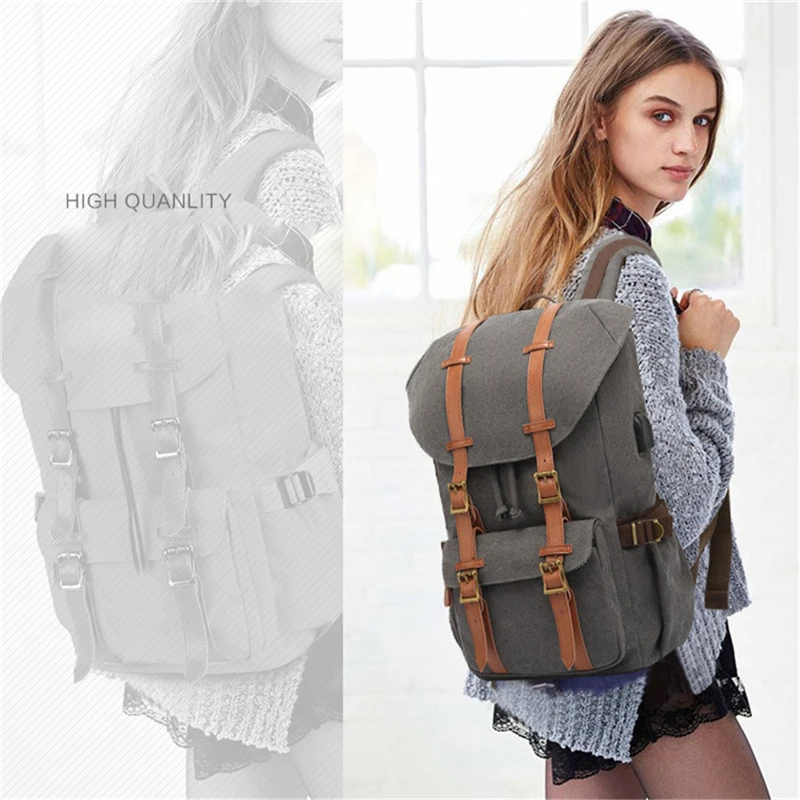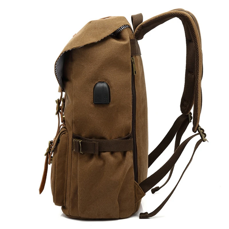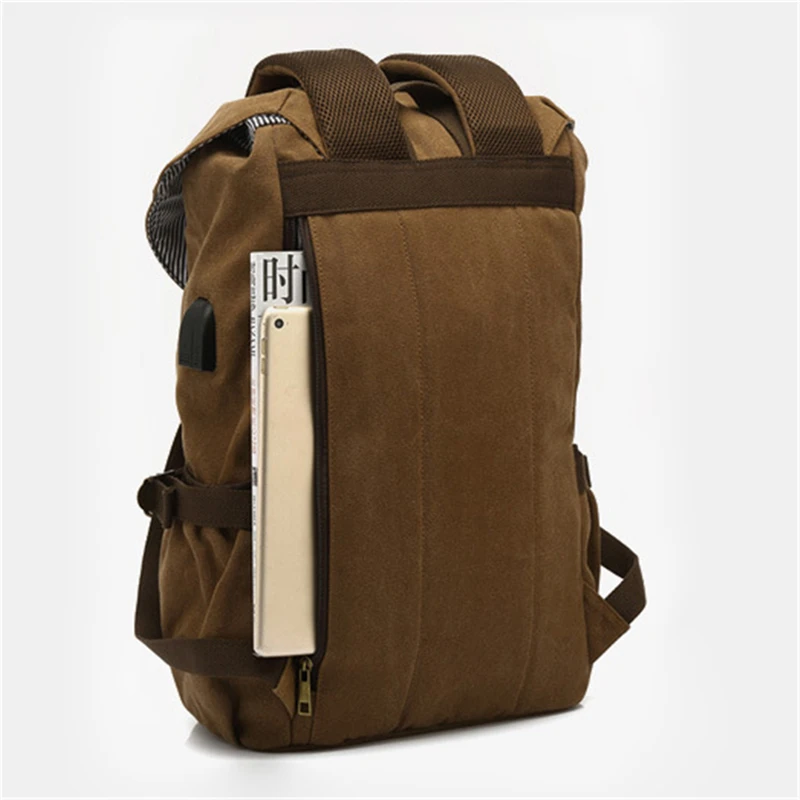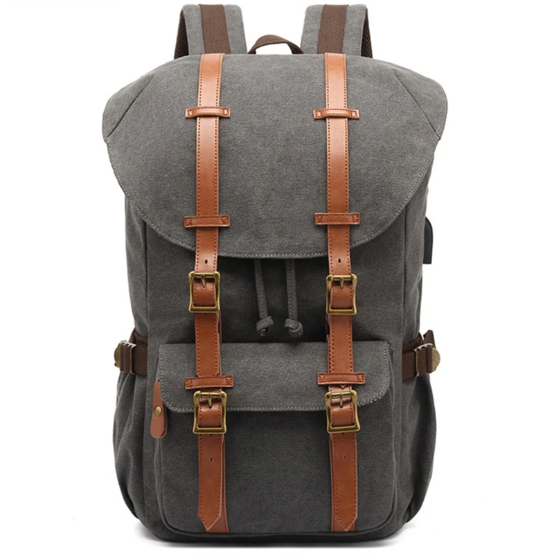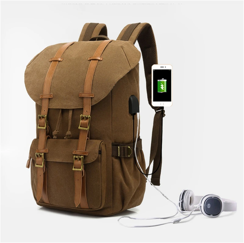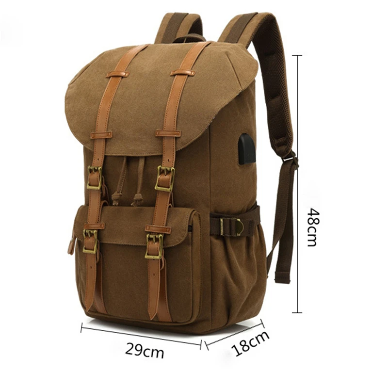 Canvas Men Travel School Backpack Fashion USB Charging 15.6” Laptop Bag Large Capacity Waterproof Beam Port Drawstring Backpack