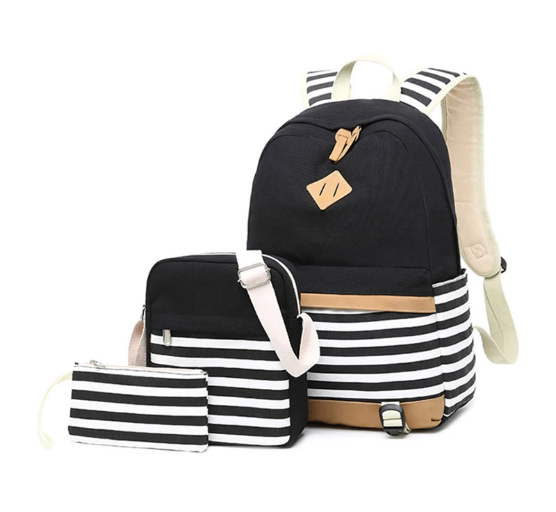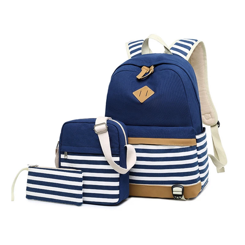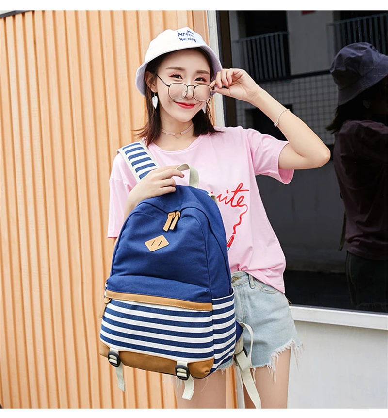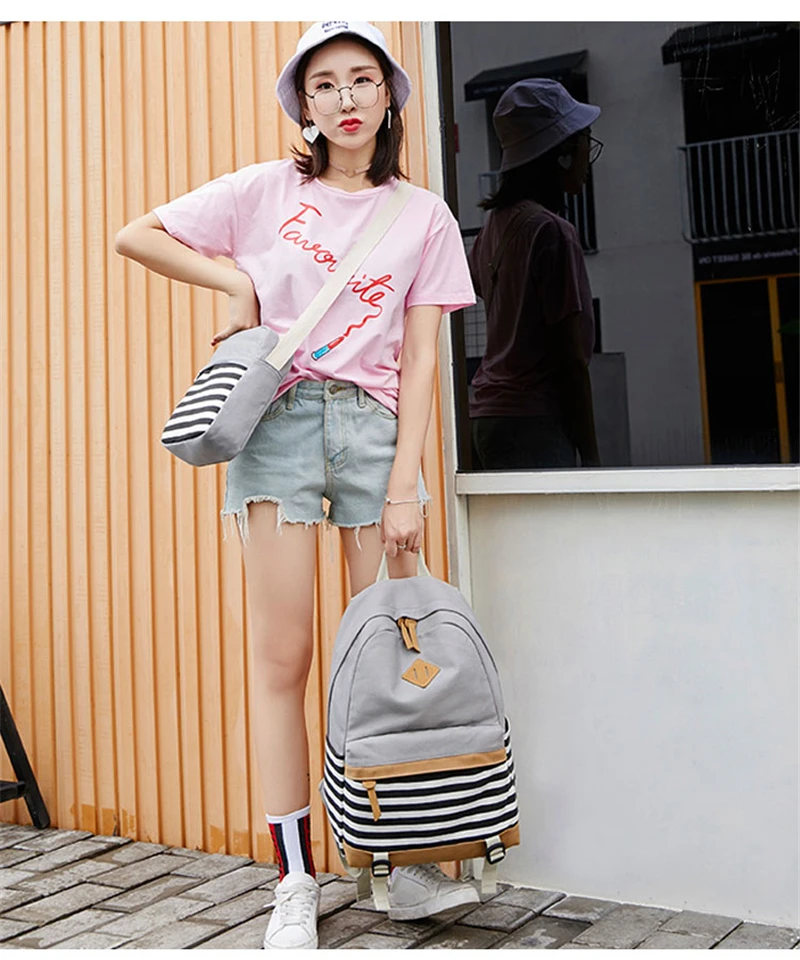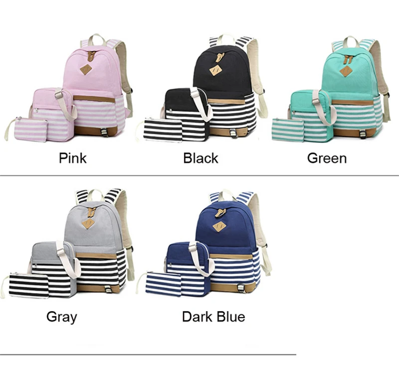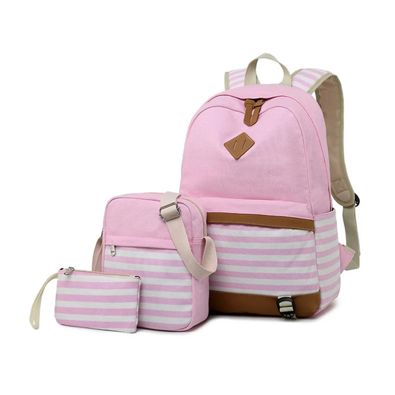 Canvas Three-piece Women’s Backpack For Teenage Girls Fashion Striped Casual Daypack Female Pink Large Capacity School Rucksacks