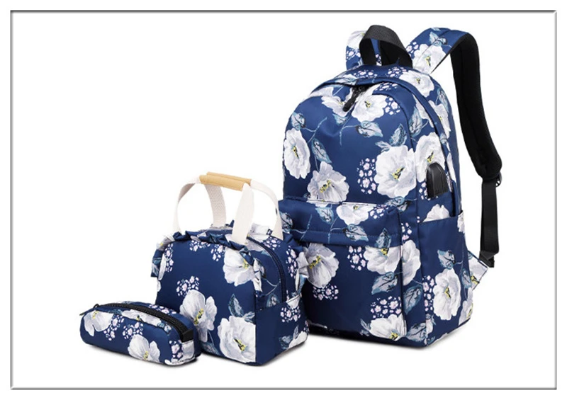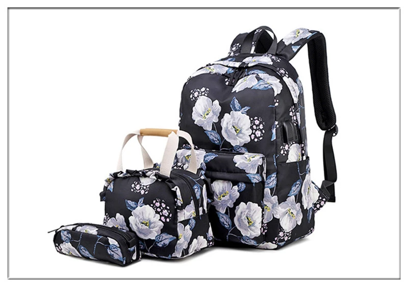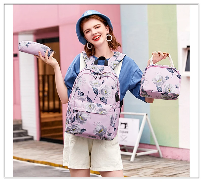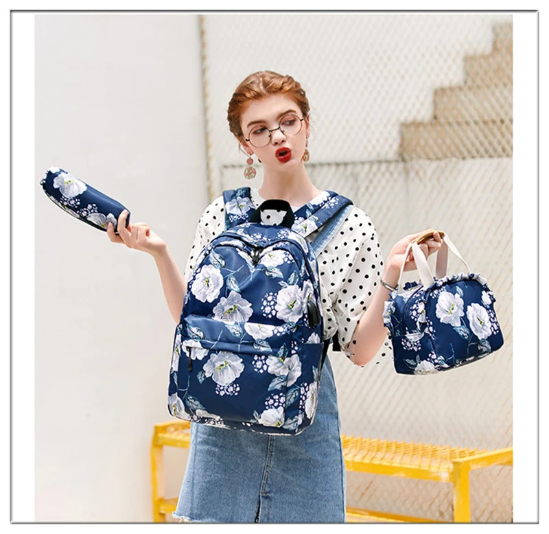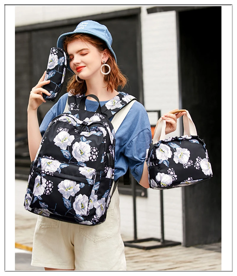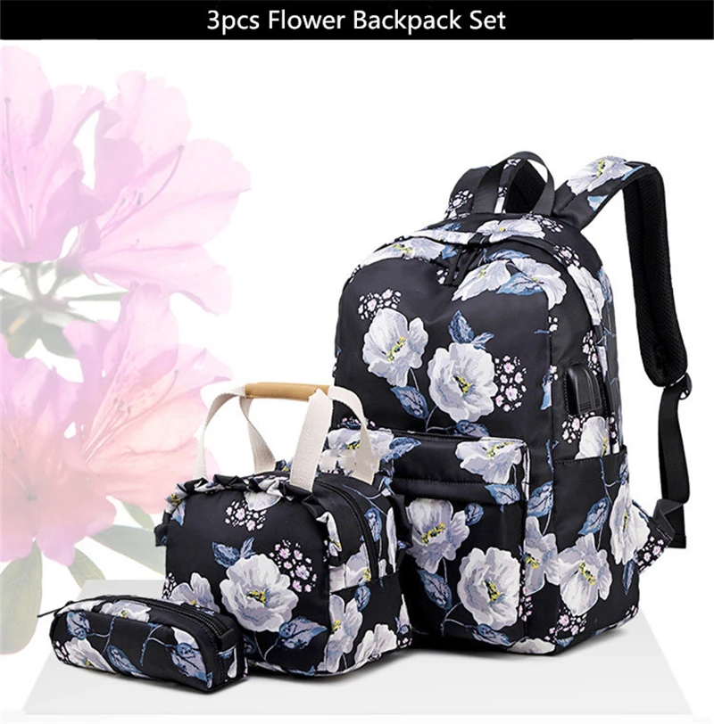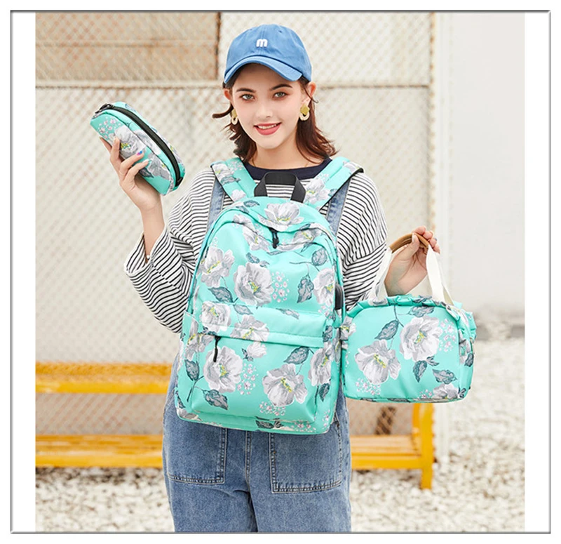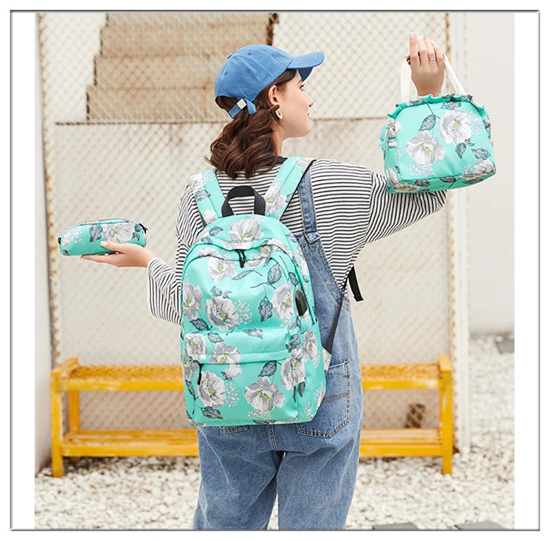 Fashion Floral Girls Backpack Three-piece School Lightweight Bookbags Nylon Waterproof Teen School Bags Set Women Travel Daypack