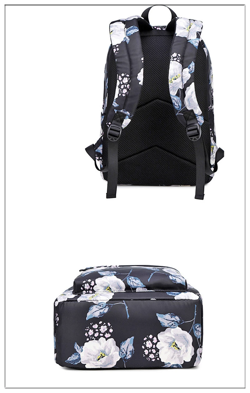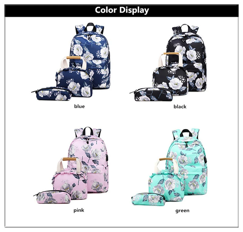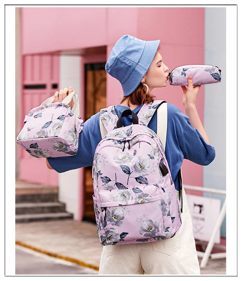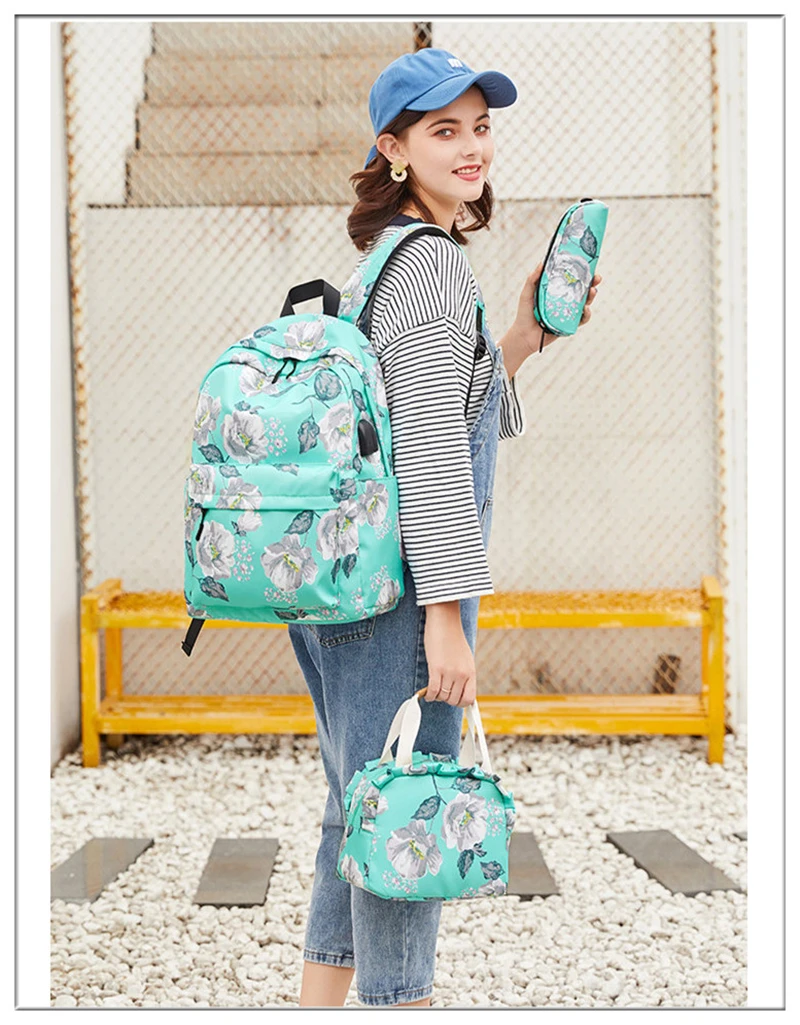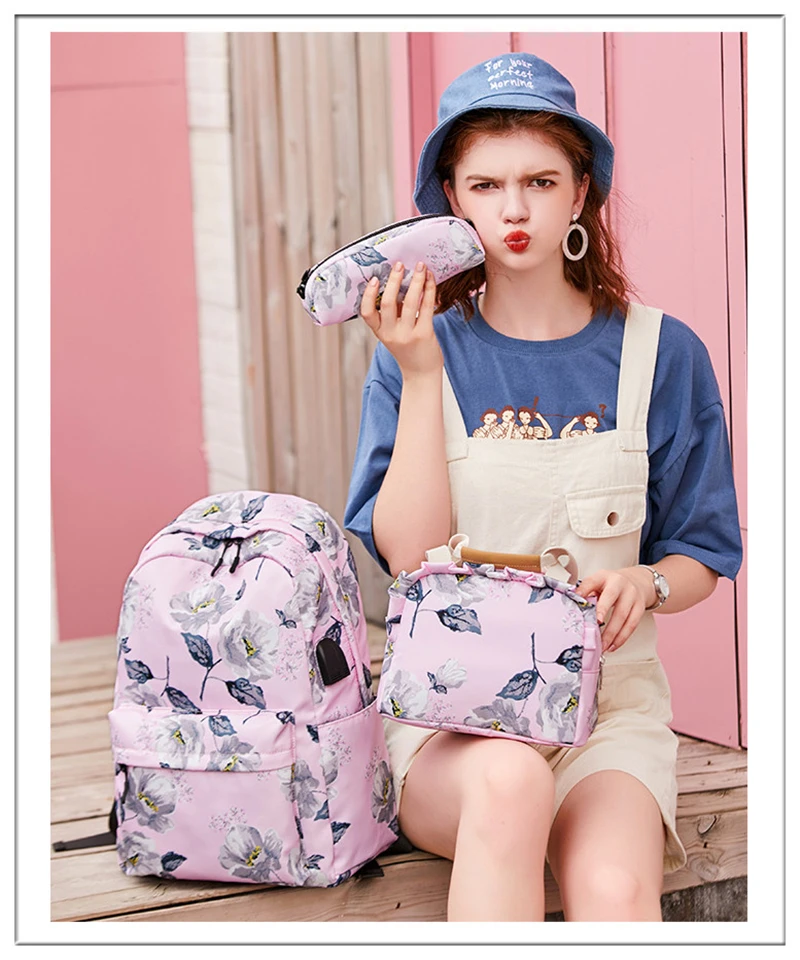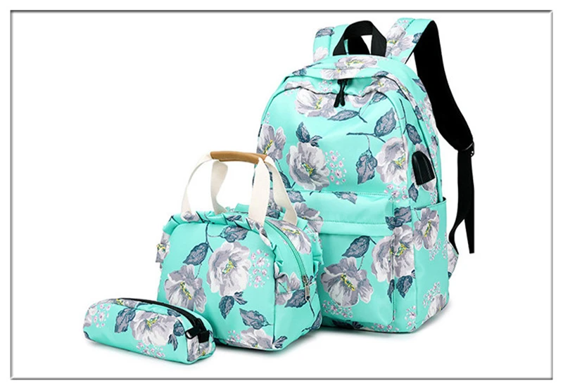 Fashion Floral Girls Backpack Three-piece School Lightweight Bookbags Nylon Waterproof Teen School Bags Set Women Travel Daypack