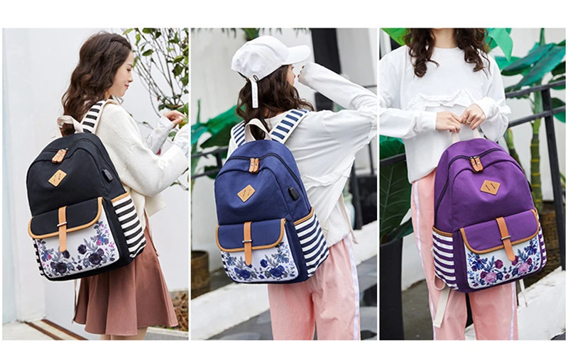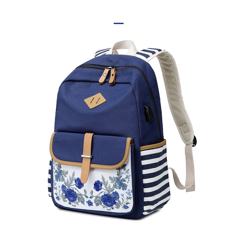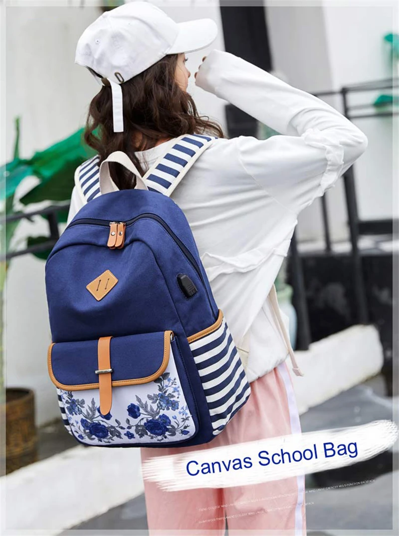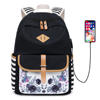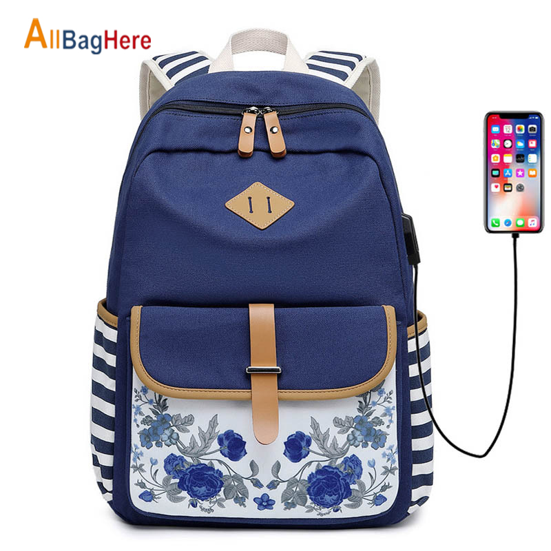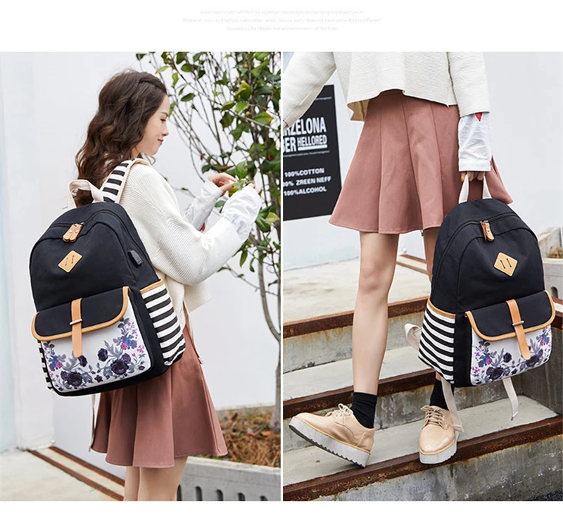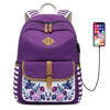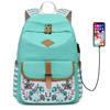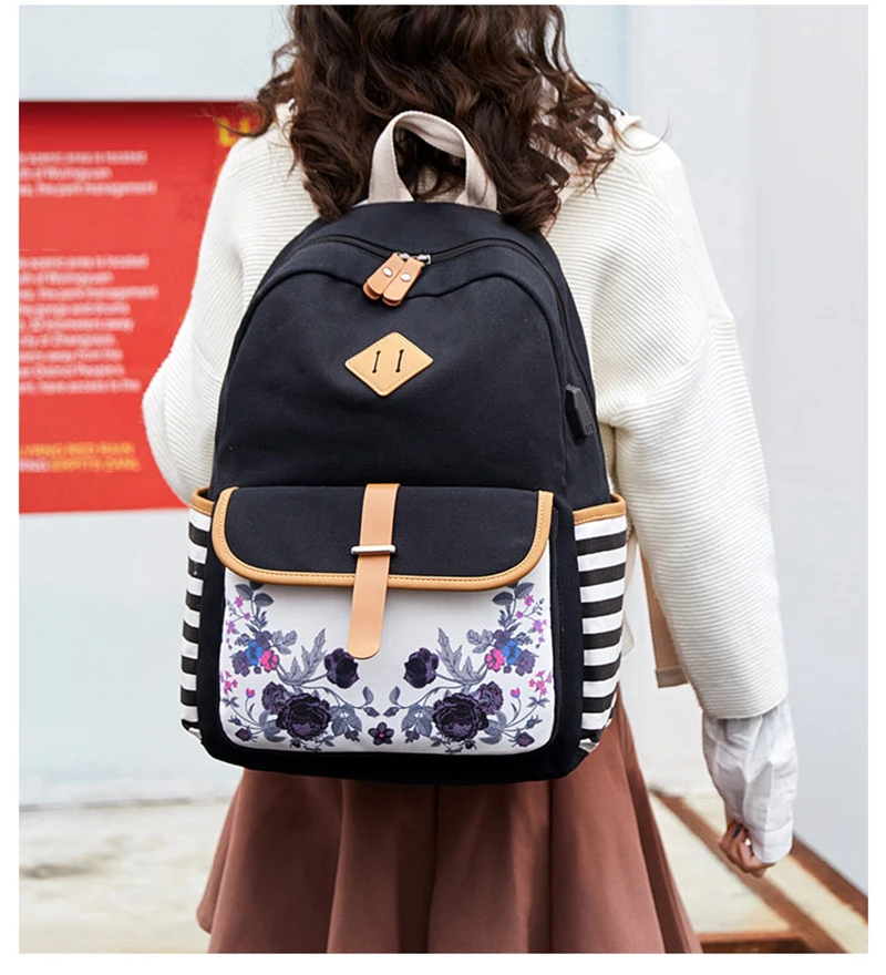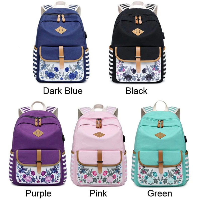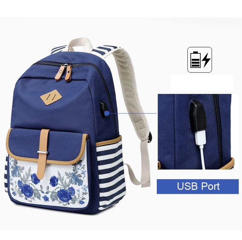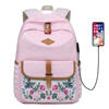Fashion Flower Priting Backpack Women Casual Lightweight Waterproof Canvas Backpack Girls School Bag USB Charging Travel Daypack