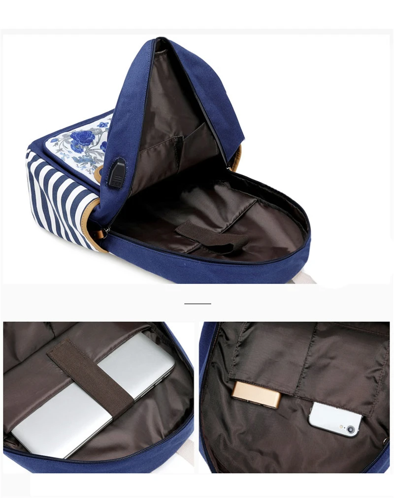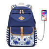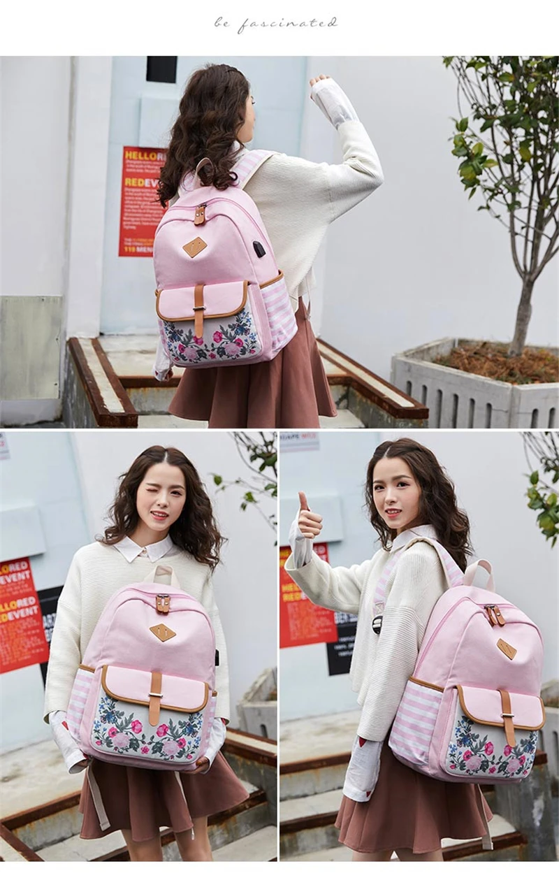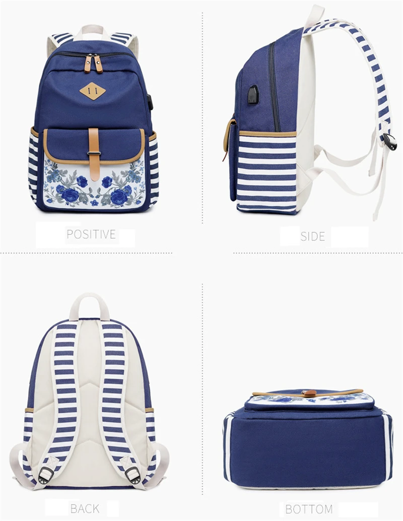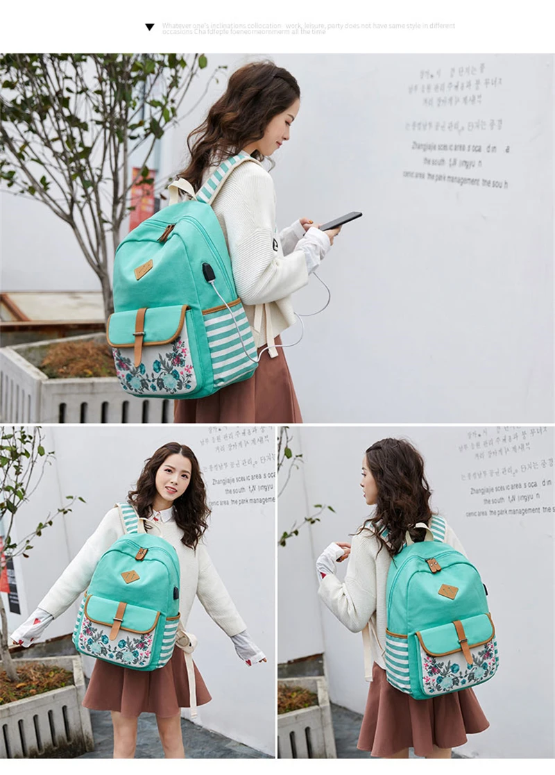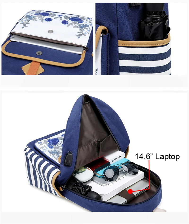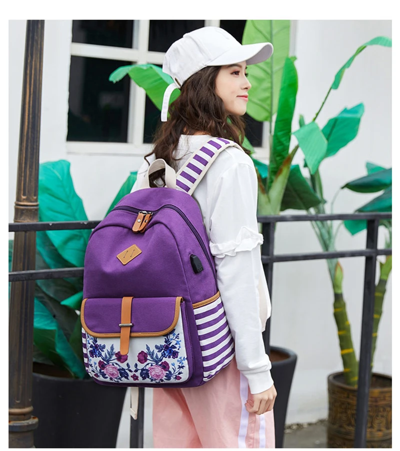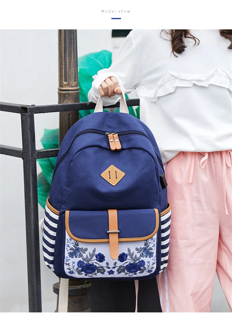Fashion Flower Priting Backpack Women Casual Lightweight Waterproof Canvas Backpack Girls School Bag USB Charging Travel Daypack
