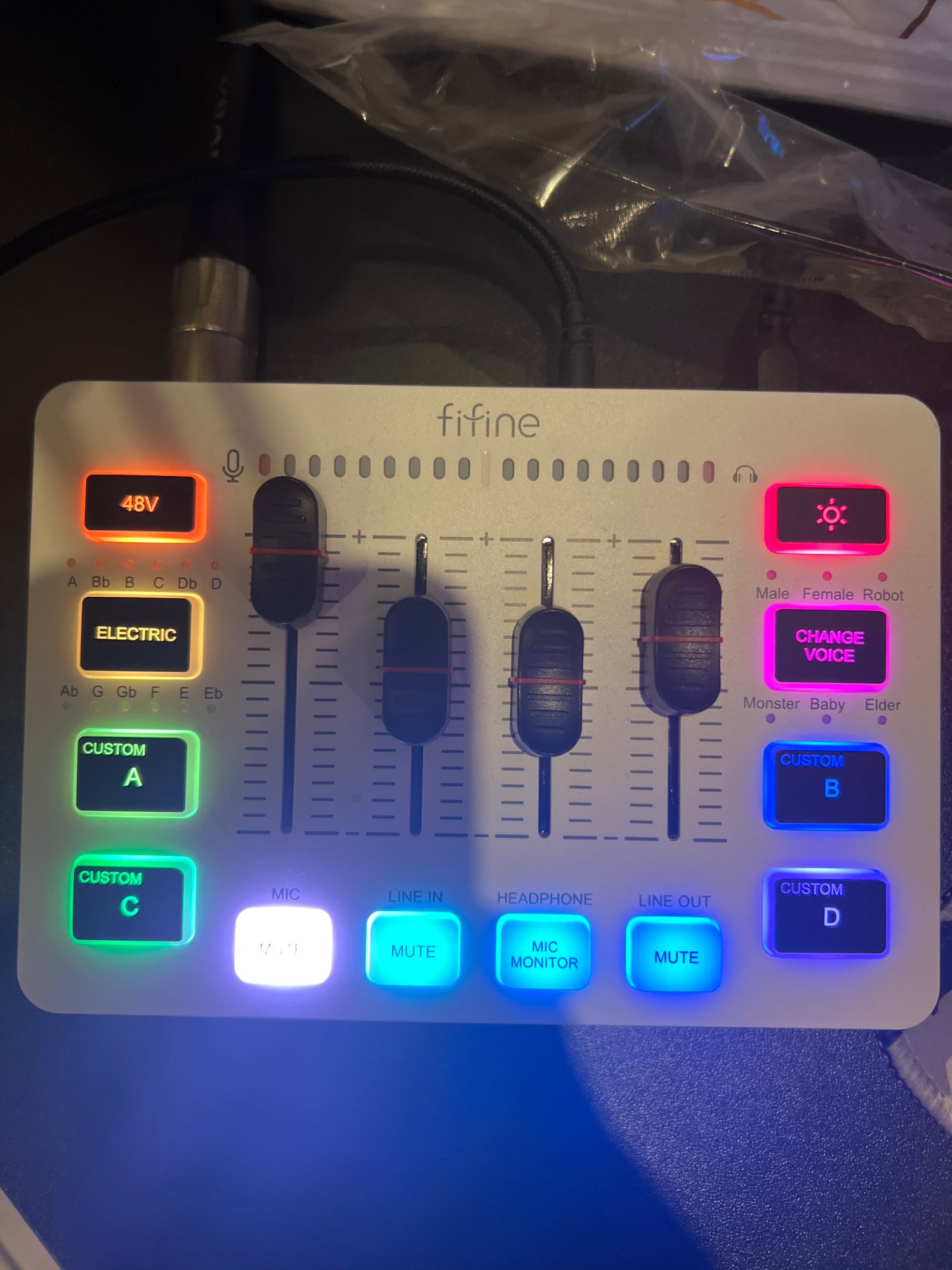 Крутой микшер. Теперь на всех звуковых устройствах регулятор громкости прямо перед носом, и также на каждом кнопка отключения звука, не надо лазить далеко. Разные световые подсветки, которые запоминаются после выключения ПК. Присутствует фантомное питание 48v, можно с помощью этого усилить микрофон.