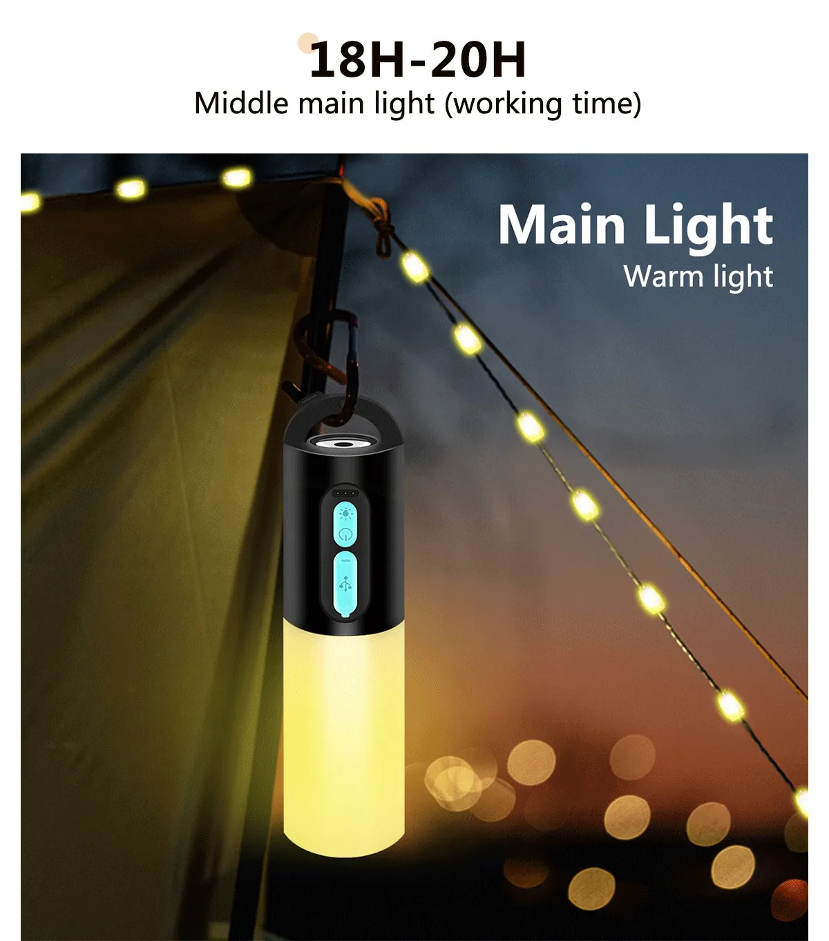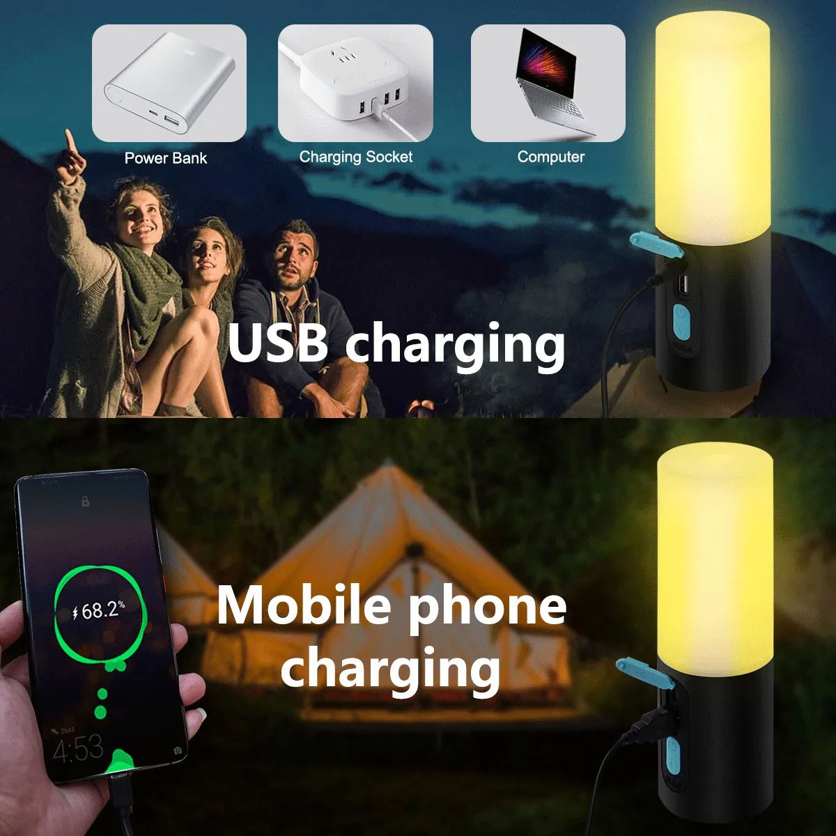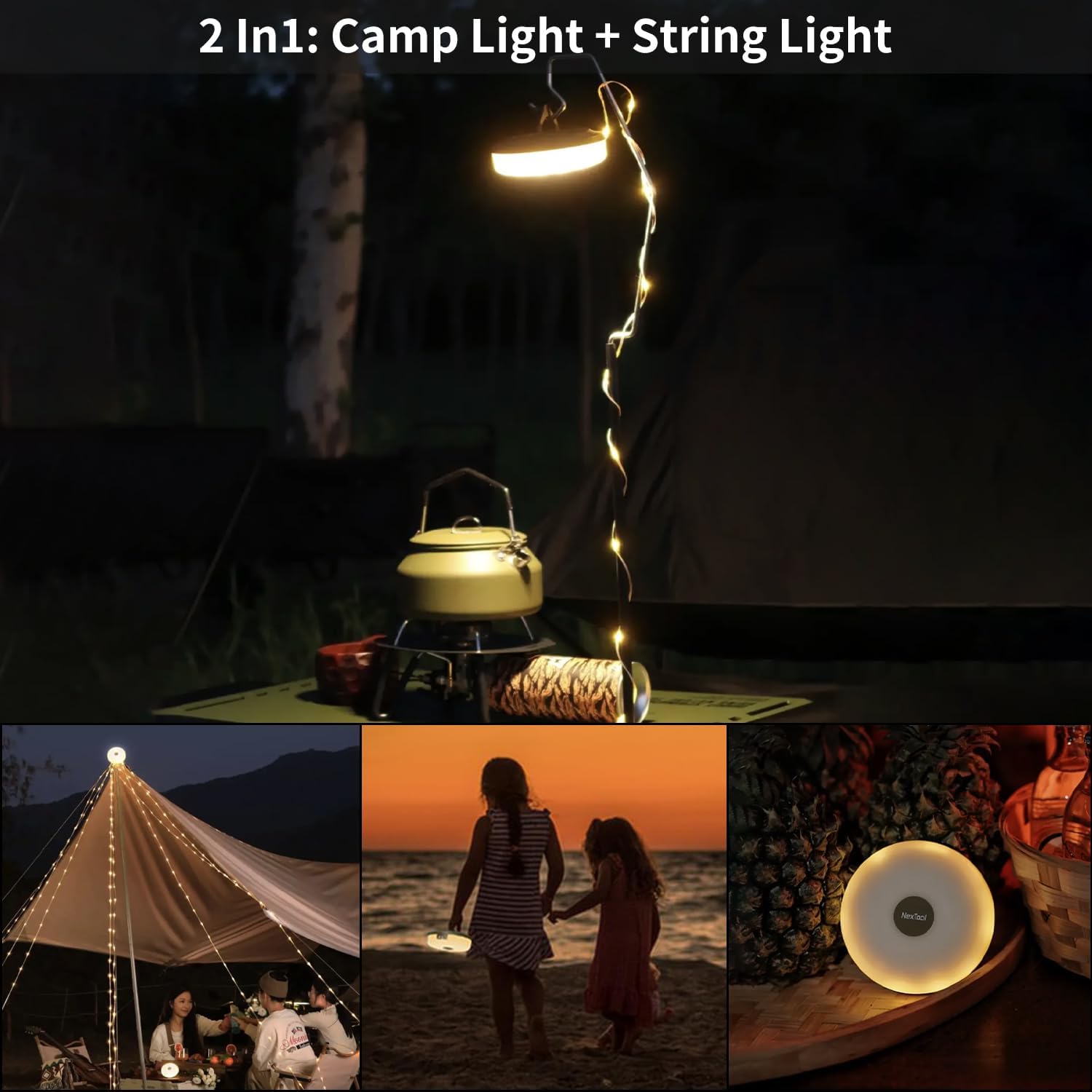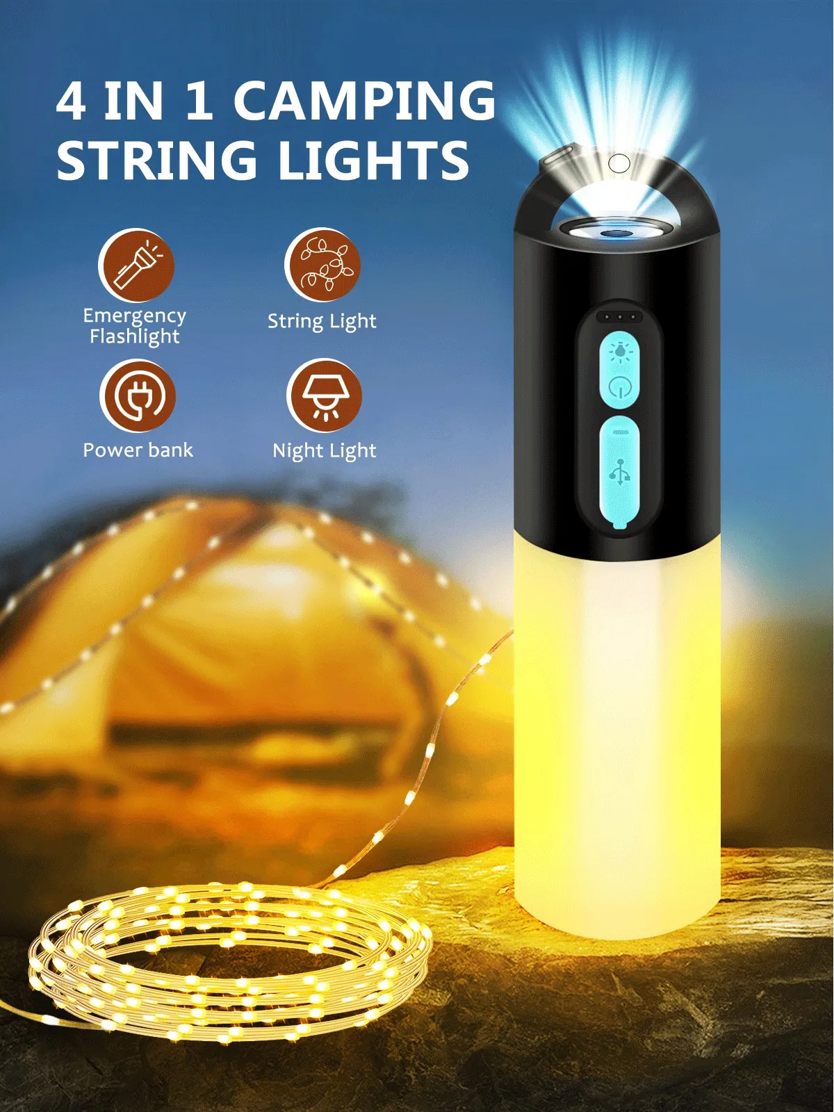 Multifunctional Camping String Lights Lantern Portable Rechargeable Flashlight with 4000mAh Charger for Emergency Camping Hiking