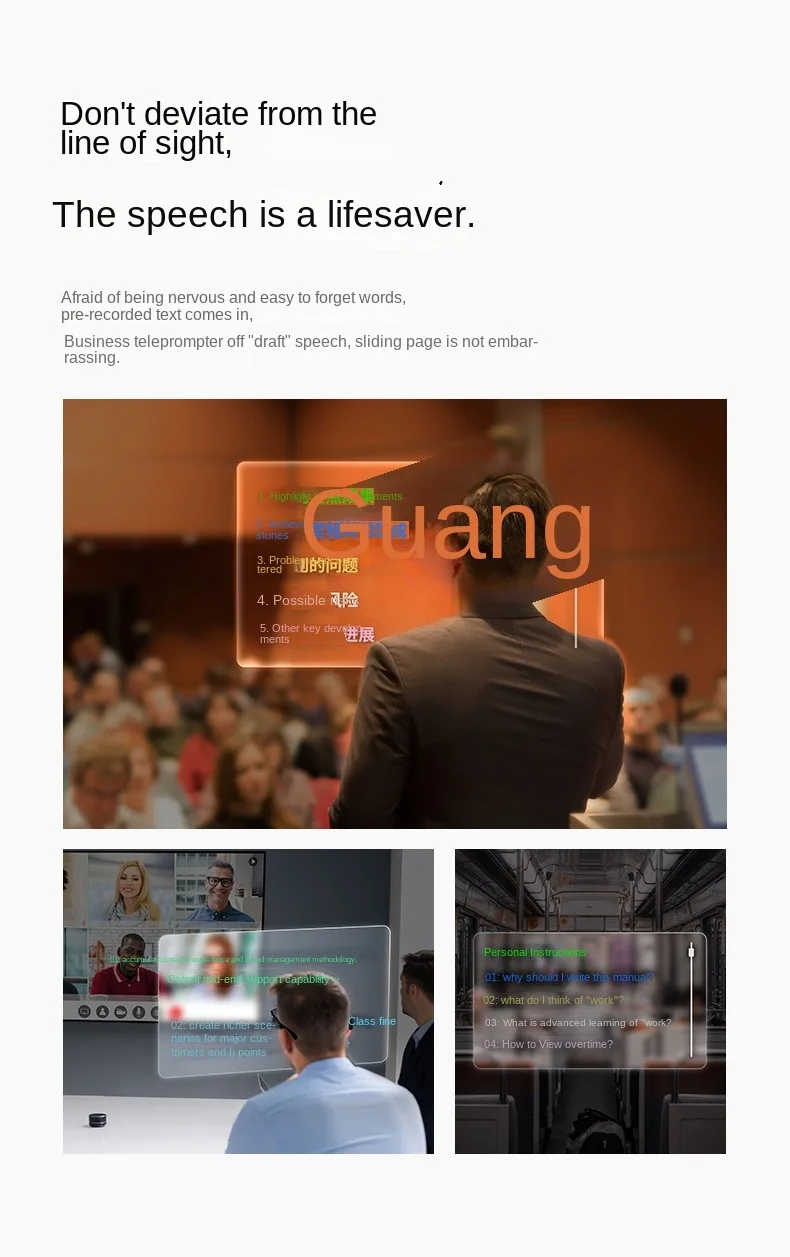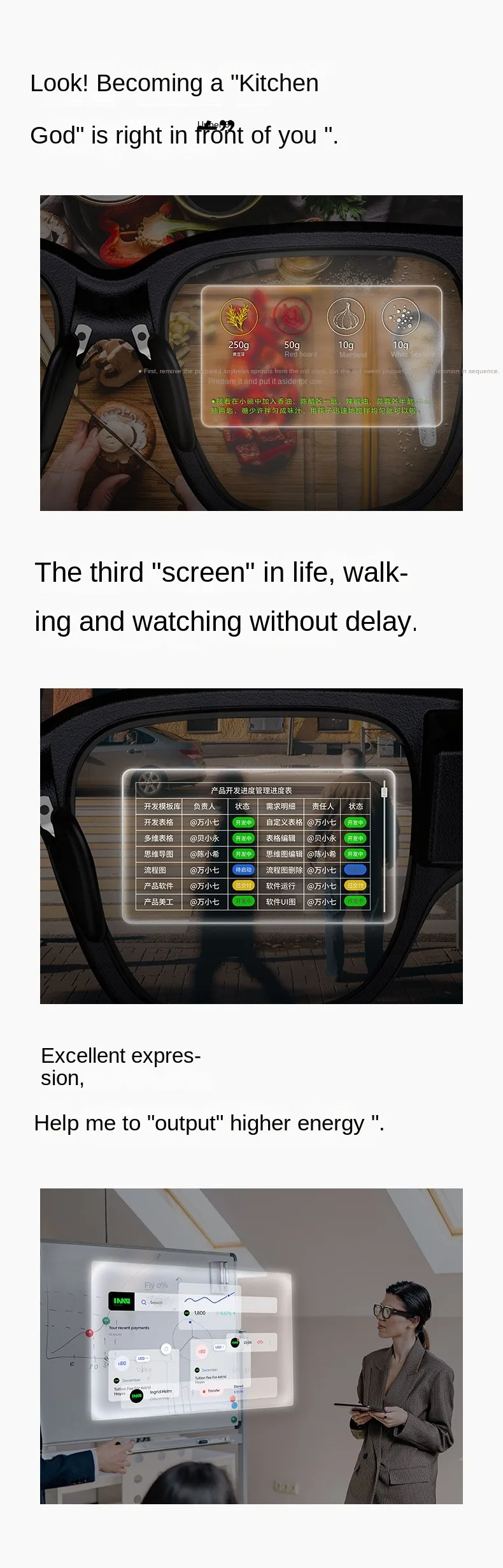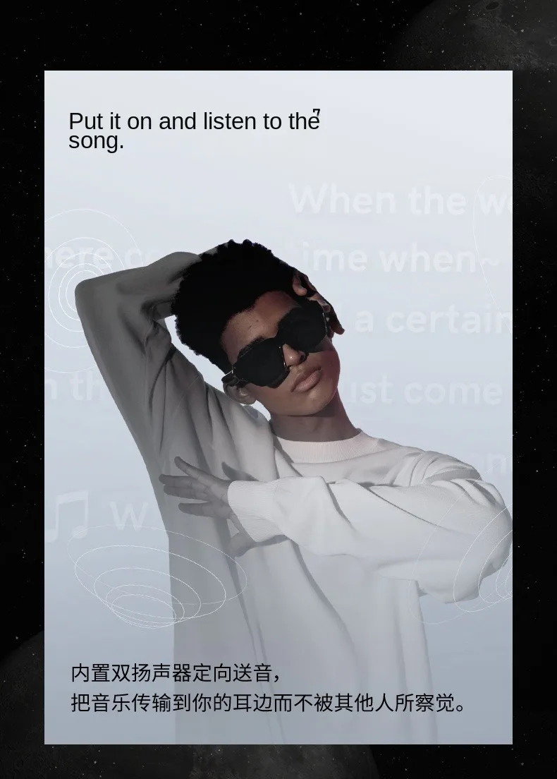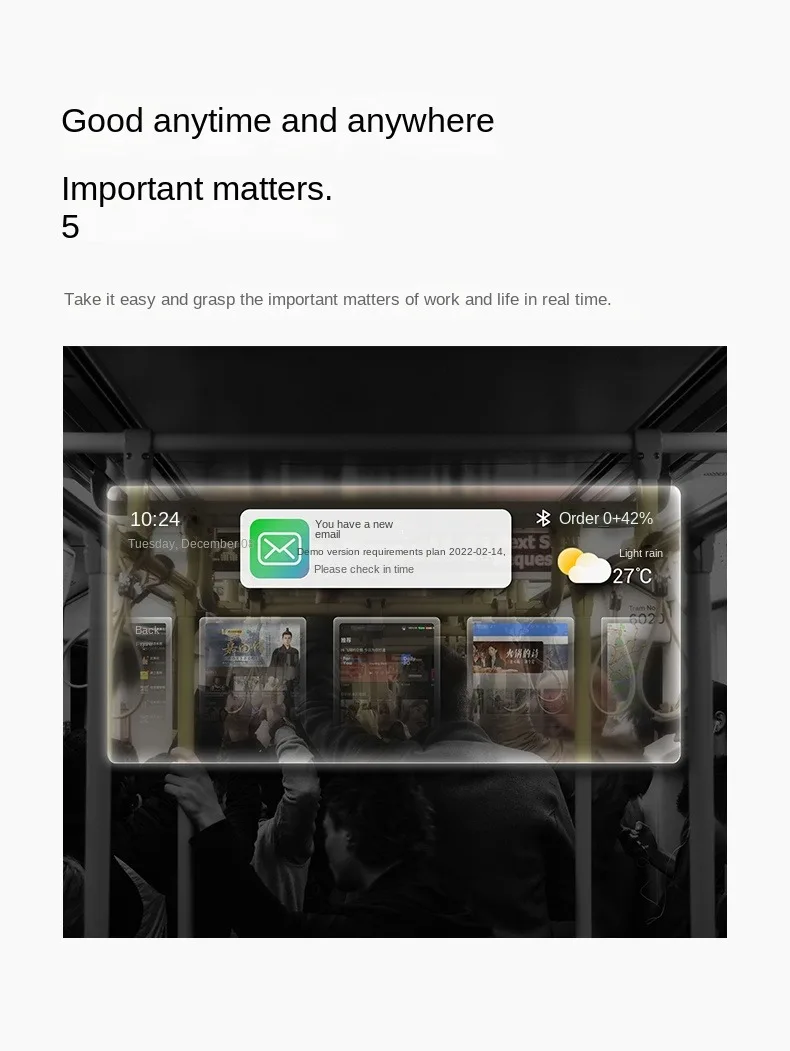 The AR glasses are great to show you detailed navigation visualized right in front of your eyes.When playing music,the playback interface and lyrics can be displayed in the lens.Moreover,the smart AR glasses allow you to set your daily schedules,check your notes,weather info and more in the lens.With a simple tap of a finger,you can hoin a group meeting or host a live broadcast.