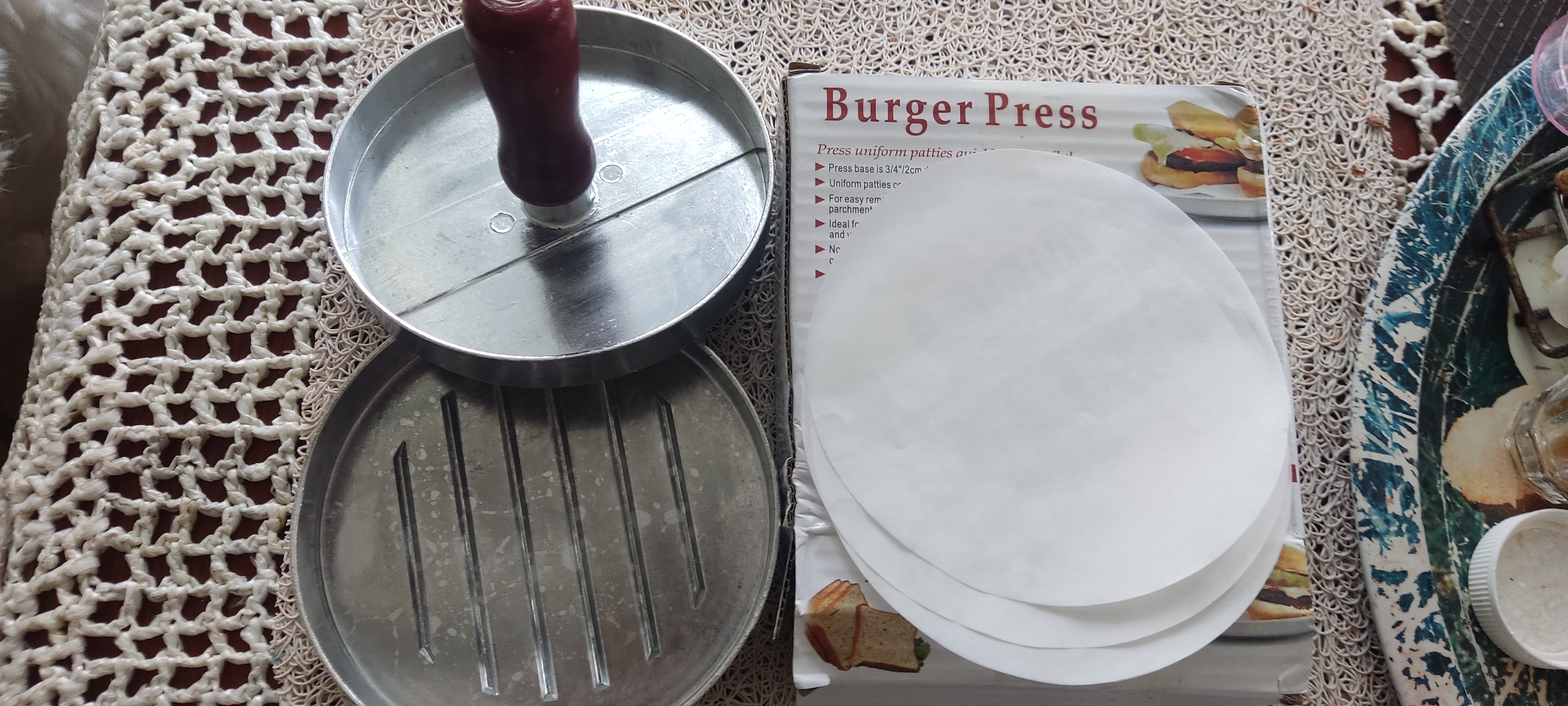 Доставка - 25 дней. Пресс для бургеров с вощеной бумагой как в описании и на фото. Качественный, большой диаметр. Спасибо продавцу за быструю доставку.