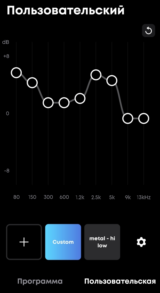 Жаль убрали mini jack вход и остался только usb. Звук достаточно громкий для такого размера. Приятный на ощупь софттач пластик. Довольно плохие стандартные настройки эквалайзера, слишком много высоких частот и почти нет низких. Но через приложение можно настроить эквализацию на свой вкус. Для прослушивания рока или метал музыки эквалайзер как на фото.