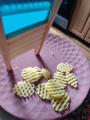 El producto funciona perfectamente. Las patatas quedan tal como esperaba. La única pega es que con ciertas variedades de patata no sirve porque se rompen, pero no es culpa del producto sino del tipo de patata.