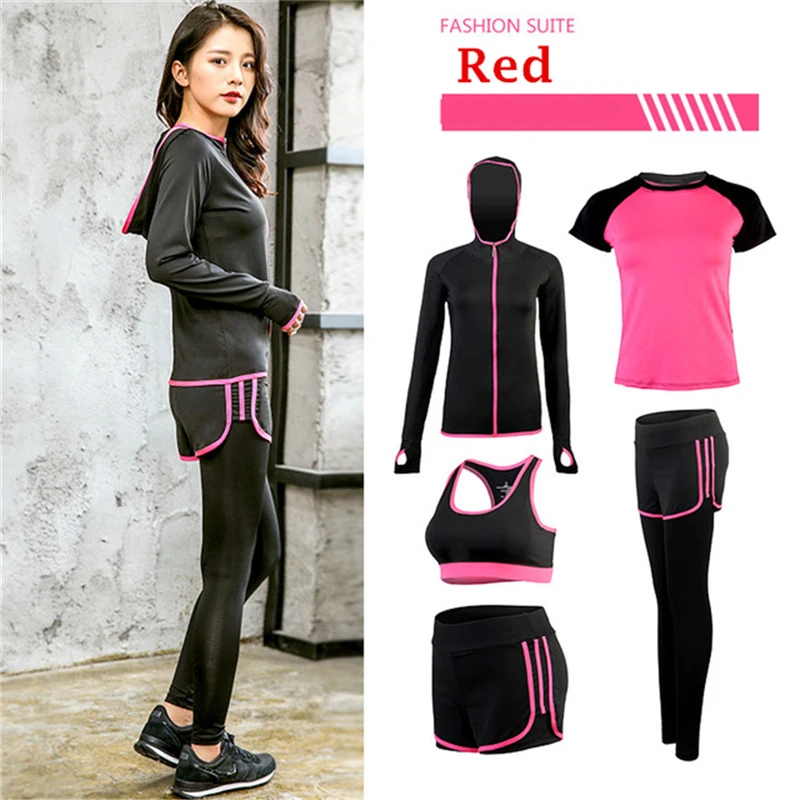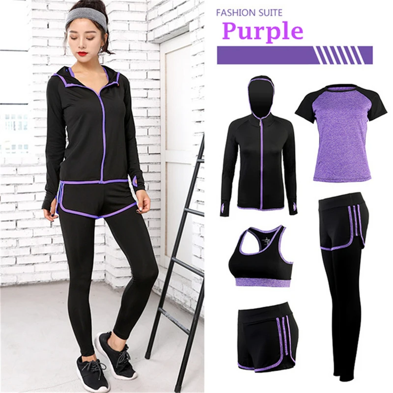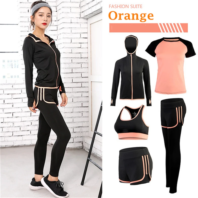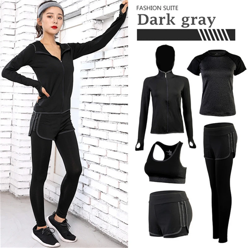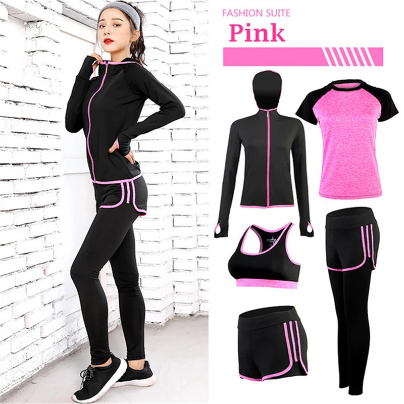 Women Yoga Set Fitness Home 5 Pcs Sports Suits GYM Cloth Yoga Thin Breathable High Waist Running Leggings Workout Pants Shirts