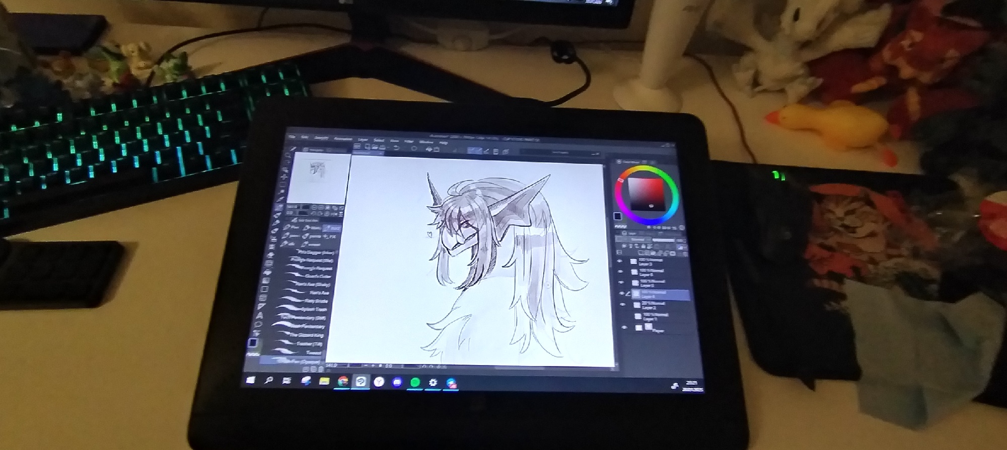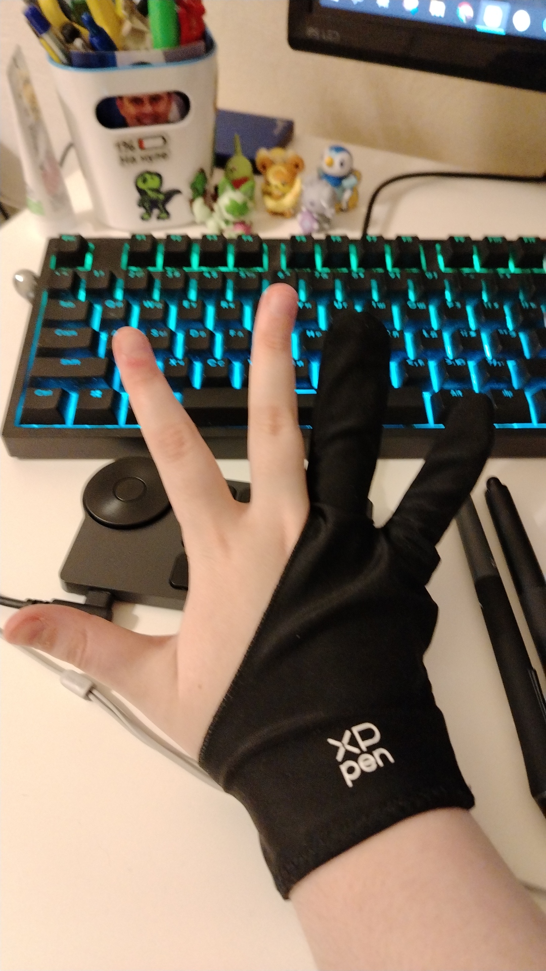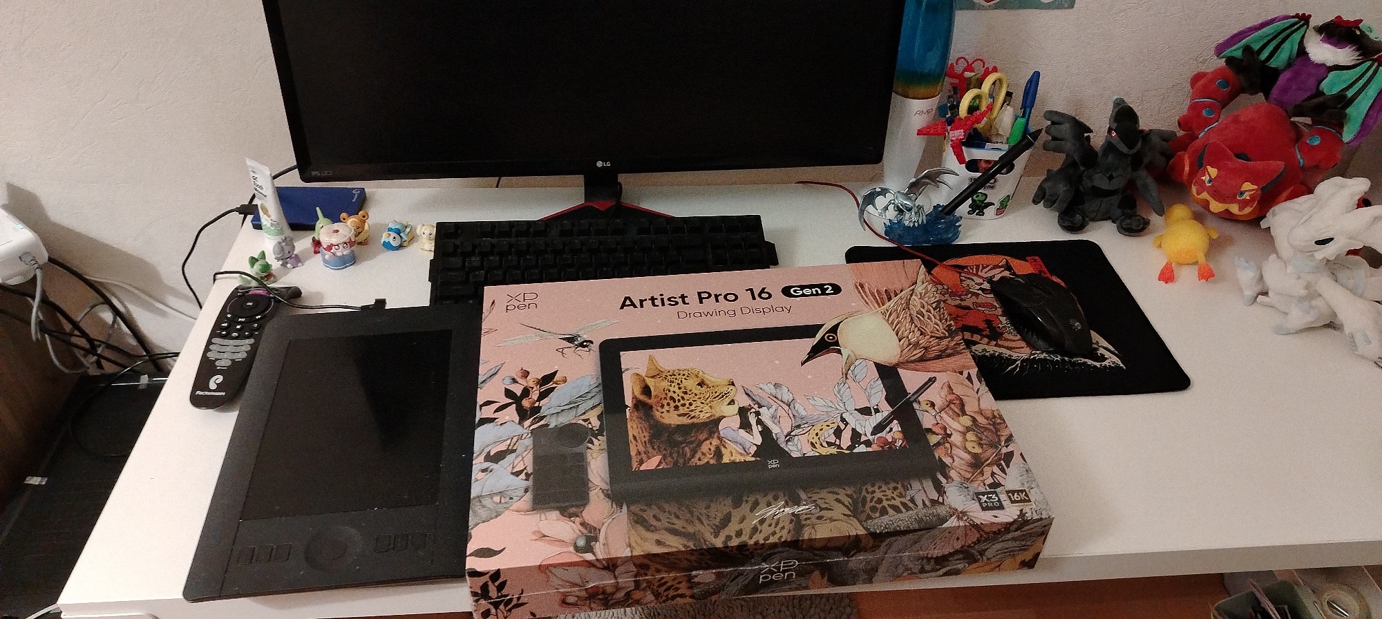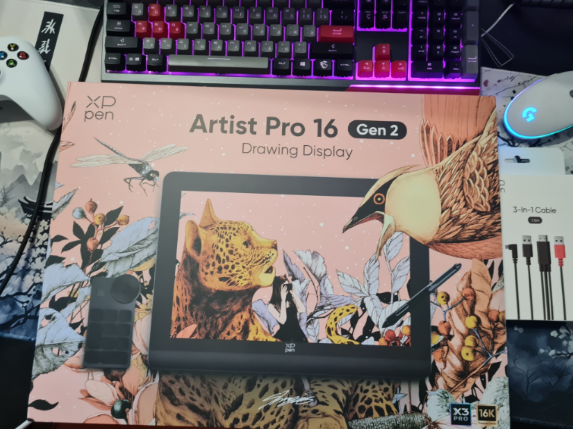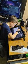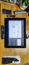 Пришло очень быстро, в целости и сохранности. С подключением никаких проблем не было, драйвера тоже сразу встали. Самое сложное было это место пересобрать на небольшом столе,чтобы было комфортно работать Пока очень непривычно,но ощущения приятные - планшет ощущается добротным, дорогим. Стилус покрыт очень приятной к касанию резиной, гораздо приятнее, чем на моем старом интусе. В остальном они почти идентичные по форме и ощущению в руке. Не знаю, насколько пульт покажет себя полезным, но как минимум менять размер кисти или холста с помощью такого ролика показалось прикольным, очень тактильно с этими пощелкиваниями выходит. цветопередача сочная, сам монитор четкий, яркий. Претензия только одна - перчатка очень большая :(