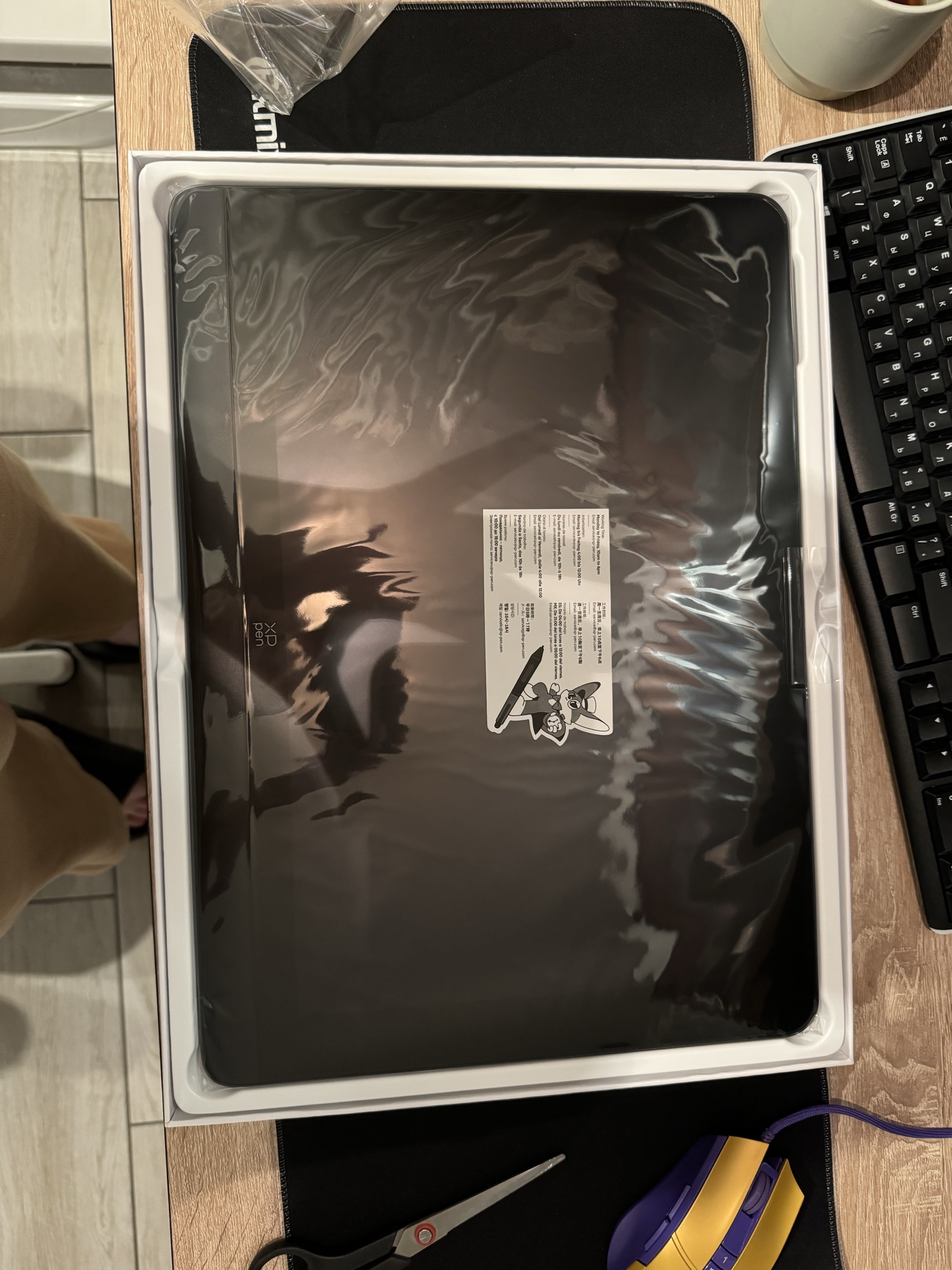 посылку отправили 19 апреля, пришла сегодня, 28 апреля. думала придет быстрее до москвы, начала переживать почему идет дольше, но все пришло в идеальном состоянии!! на коробке ни одной помятости! сам планшет тоже добрался в целости и сохранности дополню позже отзыв фото планшета в рабочем состоянии. пока успела только включить и немного потестировать планшет. все быстро подключается, легко настроить каллибровку и цветопередачу. планшет большой, легкий, удобный! отличное перо, нажатие супер, как и заявленно. буду привыкать к мини-клавиатуре, работает по блютусу, шик. я в восторге от покупки и уже не расстраиваюсь из-за долгого ожидания, потому что товар пришел целым! спасибо большое продавцу! буду осваивать новый инструмент это мой первый дорогой заказ здесь, переживала, очень ждала, и ожидание себя оправдало :)