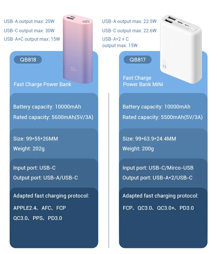 ZMI 10000mAh MINI Power Bank QB817 Two-way Fast Charging 22.5W MAX Small Size High Capacity Support Low Current Charging